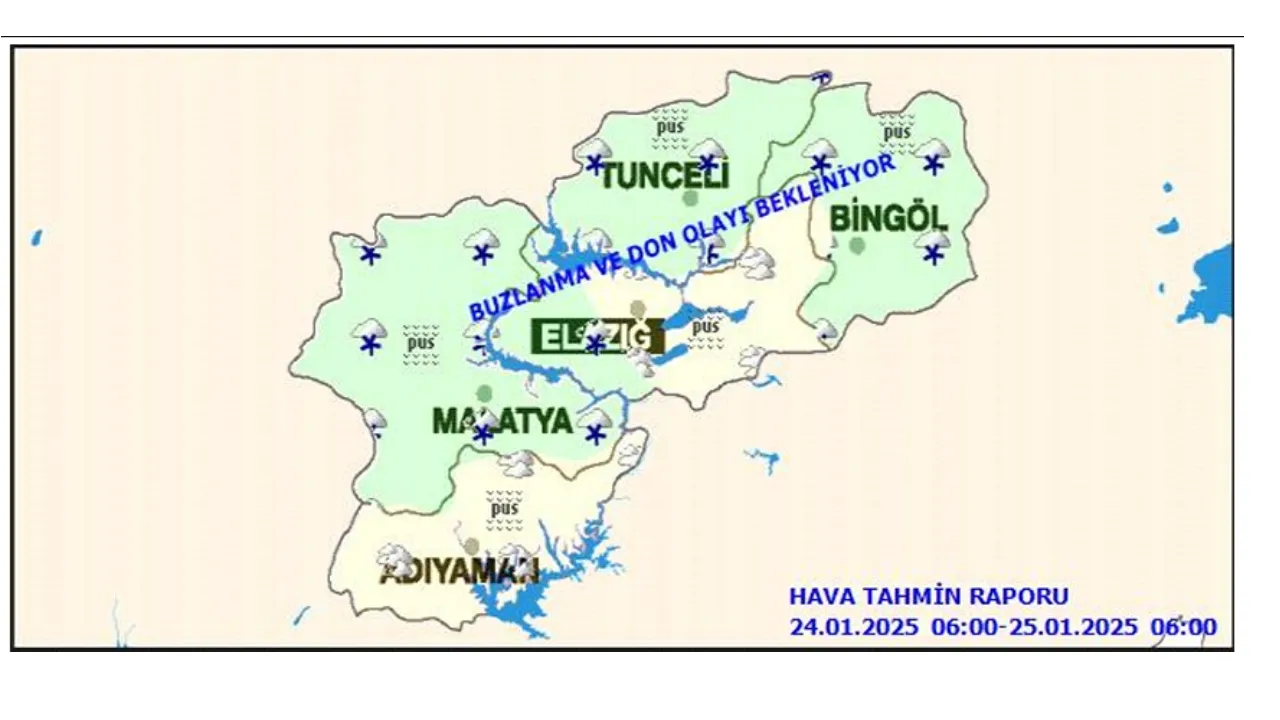 Meteoroloji Genel Müdürlüğü tarafından 24 Ocak 2025 tarihli hava tahmin raporu yayımlandı. Rapora göre Malatya, Tunceli ve Bingöl çevresinde sabah saatlerinde aralıklı hafif kar yağışı bekleniyor. Hava sıcaklıklarının mevsim normalleri civarında seyredeceği öngörülürken, sabah ve gece saatlerinde buzlanma ve don olaylarının yanı sıra yer yer sis ve pus hadisesinin görülebileceği belirtildi.