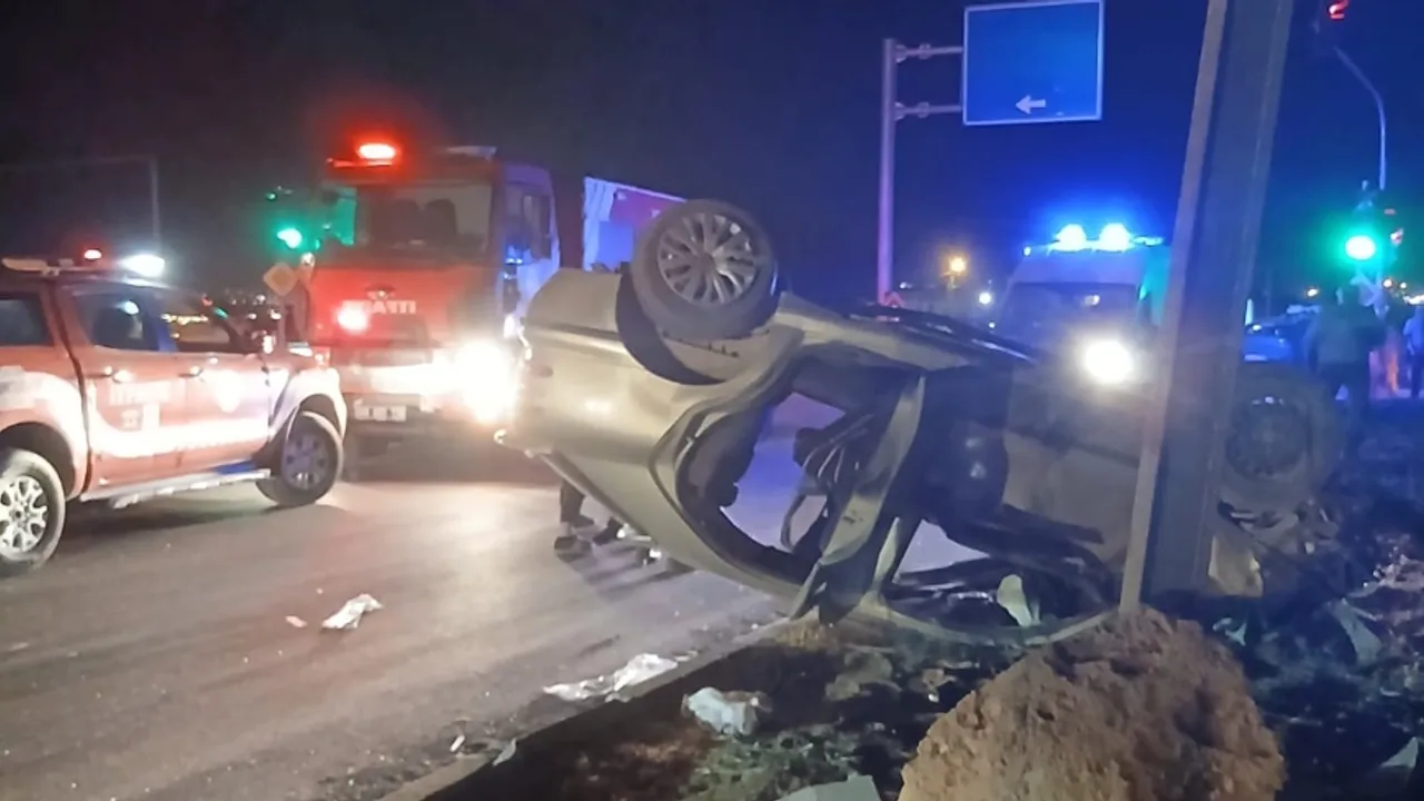 Çarpışmanın etkisiyle otomobilden biri ters döndü.